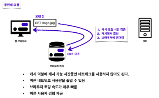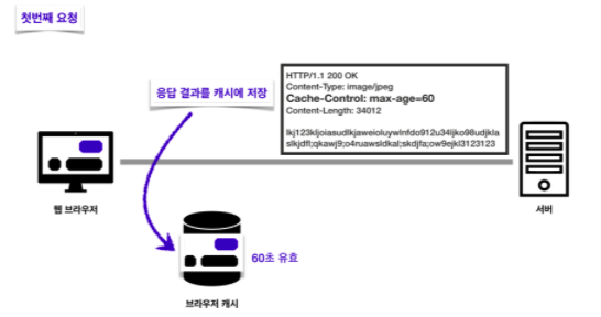 캐시는 캐시의 접근 시간에 비해 원래 데이터를 접근하는 시간이 오래 걸리는 경우나 값을 다시 계산하는 시간을 절약하고 싶은 경우에 사용합니다. 캐시에 데이터를 미리 복사해 놓으면 계산이나 접근 시간 없이 더 빠른 속도로 데이터에 접근할 수 있습니다. 브라우저에 캐시를 저장할 땐 헤더에 cache-control 속성을 통해 캐시가 유효한 시간을 지정할 수 있습니다. 이 경우 60초로 설정한다면 60초 동안은 해당 캐시가 유효하다는 의미가 됩니다.