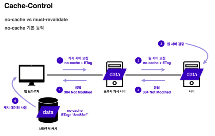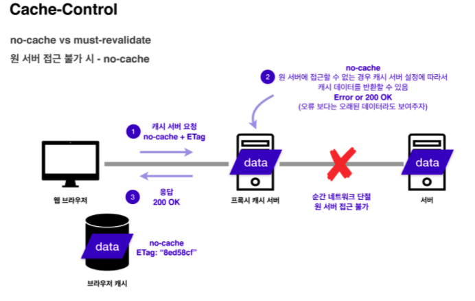만약 프록시 캐시 서버와 원 서버간 네트워크 연결이 단절되어 접근이 불가능 하다면, no-cache에서는 응답으로 오류가 아닌 오래된 데이터라도 보여주자라는 개념으로 200OK으로 응답을 합니다.
