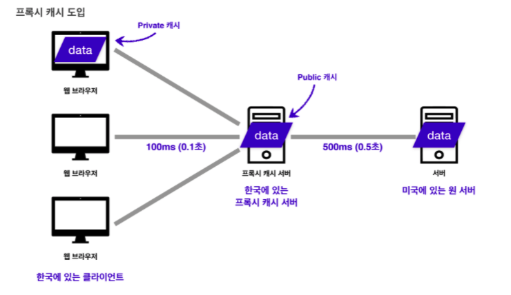 한국에 프록시 캐시서버를 두고 한국의 클라이언트는 프록시 캐시서버를 통해 자료를 가져오도록 해봅시다. 여러 사람이 찾은 자료일수록 이미 캐시에 등록되어있기에 빠른 속도로 자료를 가져올 수 있습니다. 이는 같은 국내에 있기에 원서버에 접근하는 것보다 훨씬 빠른 속도에 자료를 가져올 수 있기 때문입니다. 이때 클라이언트에서 사용하고 저장하는 캐시를 private 캐시라 하며 프록시 캐시 서버의 캐시를 public 캐시라 합니다.