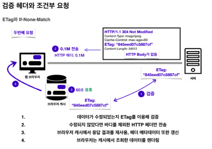 서버에서 데이터가 변경되지 않았을 경우 ETag는 동일하기에 그래서 If-None-Match는 거짓이 됩니다. 이 경우 서버에서는 304 Not Modified를 응답하며 이때 역시 HTTP Body는 없습니다. 브라우저 캐시에