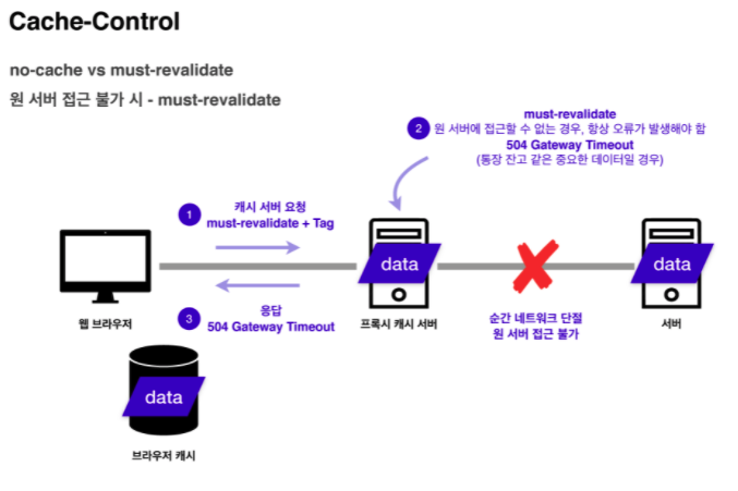하지만 must-revalidate라면 원 서버에 접근이 불가할 때 504 Gateway Timeout 오류를 보냅니다. 통장 잔고 등 중요한 정보가 원 서버를 못 받았다고 해서 예전 데이터로 뜬다면 큰 문제가 생기기때문에 이런 경우 must-revalidate를 써야 합니다.
