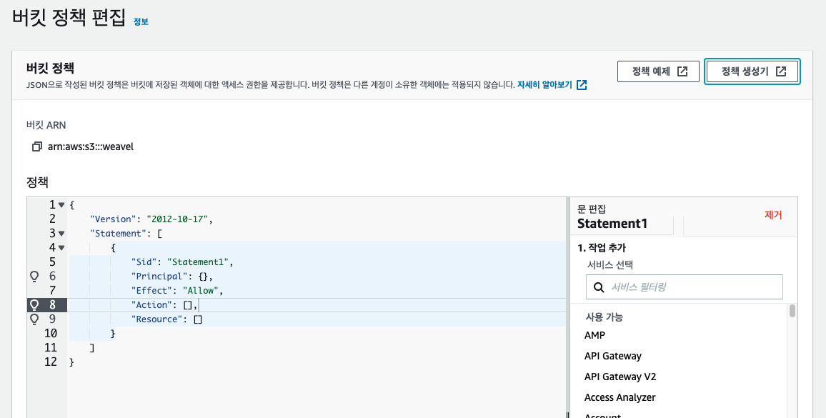 이제 마지막으로 버킷 정책을 편집해주면 됩니다.