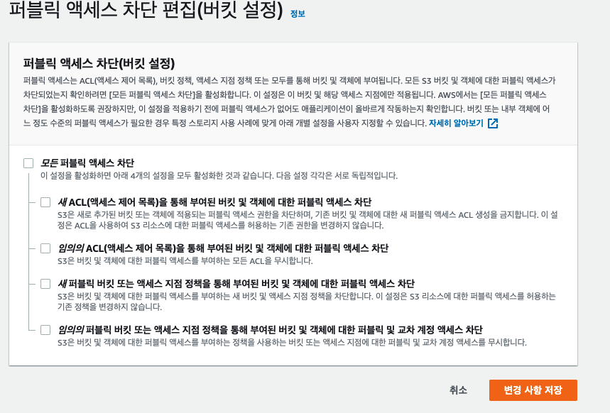 퍼블릭 액세스 차단 해제를 해주면 됩니다.