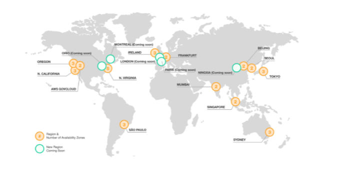 이 지역을 '리전(Region)'이라고 부릅니다. 리전이란 AWS에서 클라우드 서비스를 제공하기 위해서 운영하는 물리적인 서버의 위치를 뜻합니다. 그리고 지도를 다시 보시면 주황색 동그라미 안에 숫자가 새겨져 있는데, 이 숫자는 리전에 위치한 가용 영역의 수를 뜻합니다. 가용 영역(Availability Zone)이란 각 리전 안에 존재하는 데이터 센터(IDC)를 뜻합니다. 가용 영역은 각각 개별적인 위치에 떨어져서 존재합니다. 그래서 한 곳의 가용 영역이 재난이나 사고로 인해 가동이 불가능해지더라도 다른 가용 영역에 백업을 해놓은 데이터를 활용하여 문제없이 서버가 가동되게 합니다. 이런 가동 방식 덕분에 AWS에서 제공하는 서비스들은 높은 가용성과 내구성을 보장합니다.
