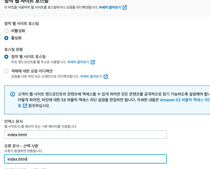 다시 정적 웹사이트 호스팅으로 돌아가면 엔드포인트가 생성되어있지만 아직 사용할 수 없습니다.
