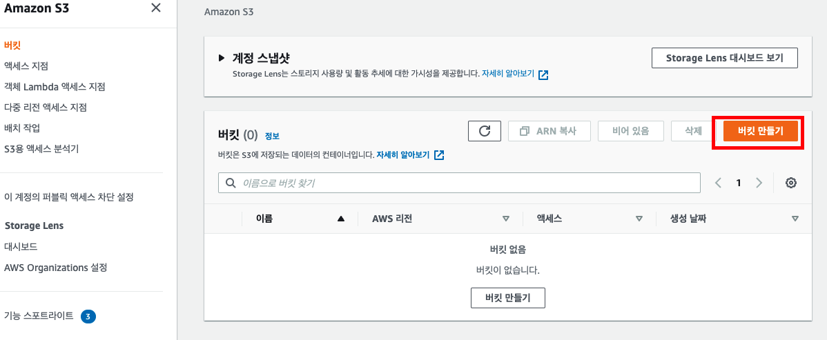 버킷 만들기에서 버킷 이름만 자유롭게 지어 생성합니다.