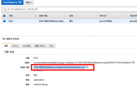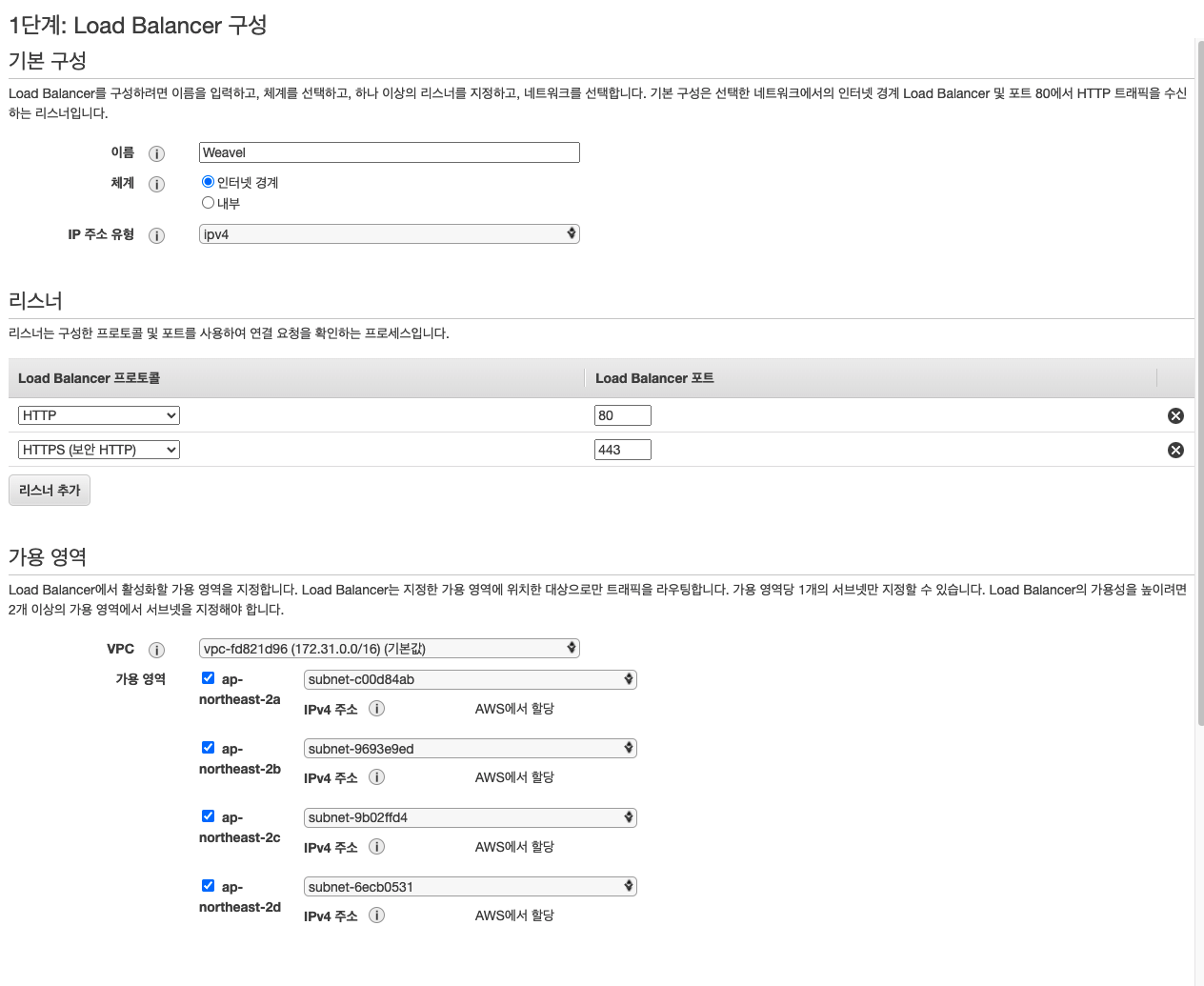 이름, 리스너, 가용영역(모두체크) 설정을 아래 이미지처럼 해줍니다.