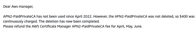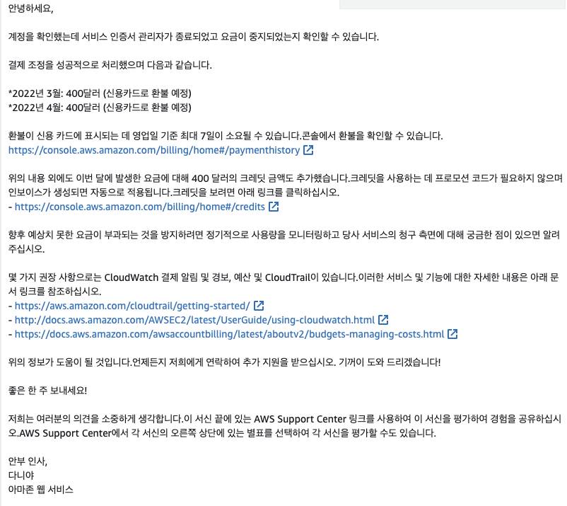 회사에서 AWS의 청구서를 확인해 봤는데, 너무 과도하게 청구가 되어 세부적으로 확인을 해봤더니, 사용하지 않는 서비스인데 매달 400달러씩 나가고 있었습니다. 한국 돈으로 50만원으로 3달 동안 청구가 되었습니다. 개인적인 실수로 10만원 환불을 받아본 경험은 있었지만, 큰 금액까지 될지 반신반의를 했습니다.