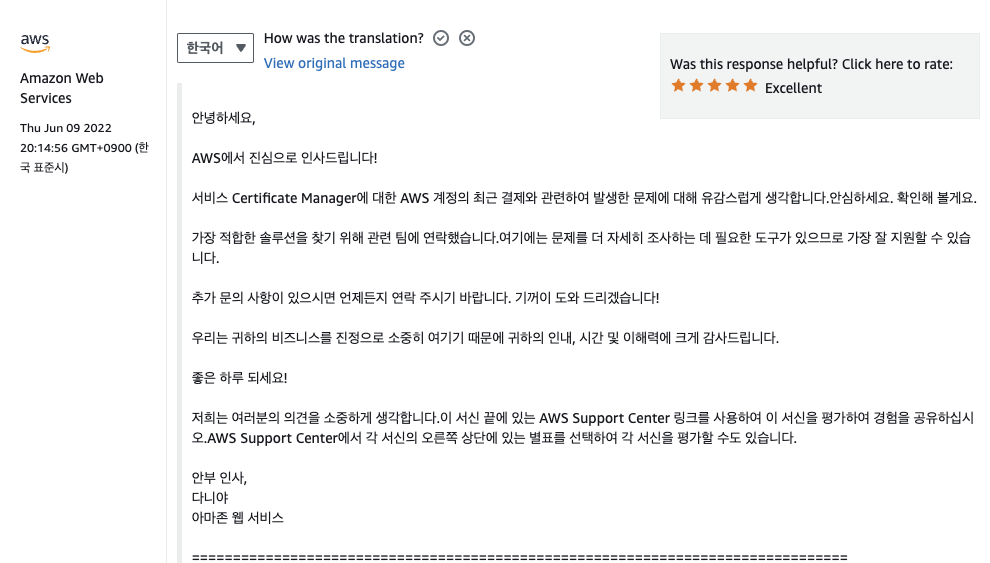 문의 답변은 한국어로 번역되어 볼 수 있습니다. 길어봐야 하루 뒤에 확인 해보겠다는 답변이 돌아오고