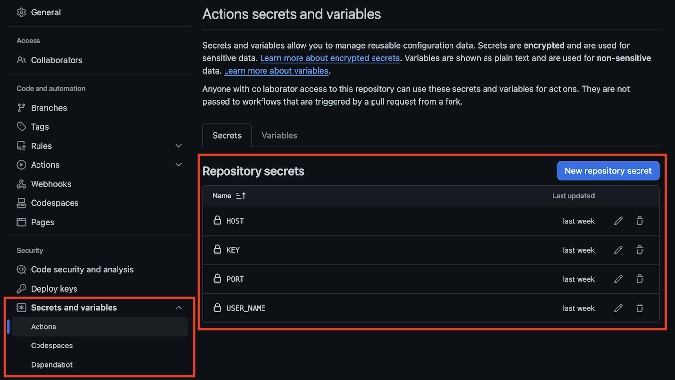 1. 우선 깃의 레포지토리에서 settings 탭에 들어갑니다. 그리고 ssh 접속을 위한 환경변수 세팅을 해줍니다.