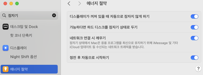 맥미니를 유지하기 위한 설정 입니다. 필요에 맞게 설정 하시면 됩니다.