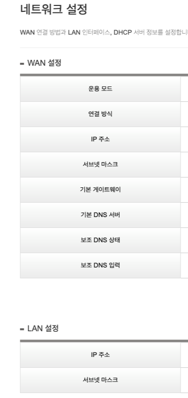 공유기에서 관리자 모드로 들어가게 되면 아래와 같이 확인 가능한데 WAN의 IP가 외부 IP, LAN은 내부(해당 공유기) IP 으로 생각하면 됩니다. 외부에서 접속하거나 연결을 시도할때 WAN의 IP를 통해 접속하면 됩니다.