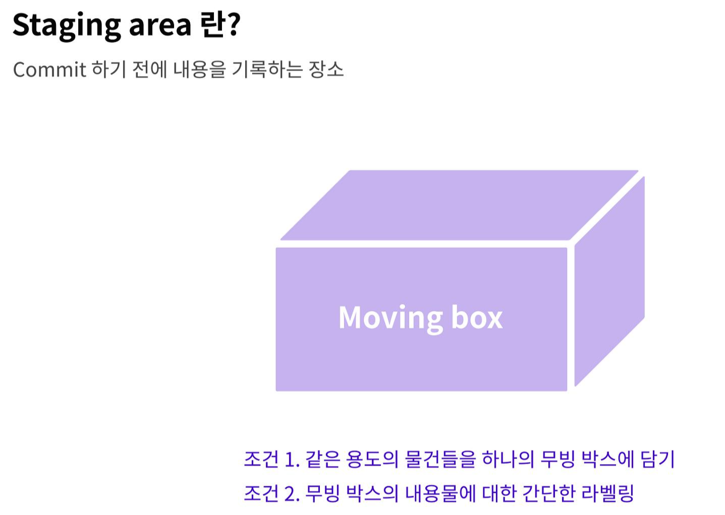 만약에 여러분이 이사를 가기 위해서 물건을 무빙 박스에 담아야하는 상황을 가정해 보겠습니다. 무빙 박스에는 물건을 넣을 수도 있고 꺼낼 수도 있습니다. 주방, 거실, 침실의 물건들을 같은 상자에 섞으면 나중에 꺼내어 볼 때 불편하겠죠? 같은 용도의 물건들을 한 박스에 넣는 것이 좋을 거예요. 물건들을 박스에 모두 담았다면 밀봉 후 라벨링을 해서 각각의 용도를 적어 주면 나중에 박스를 열어볼 때 편할 거예요. 여기서, 이 무빙 박스가 바로 commit 을 만들 수 있는 staging area이고 박스에 어떤 용도의 물건인지 간단한 코멘트를 적은 라벨링을 해 주는 것이 바로 commit 이라고 이해해 주시면 좋겠습니다.