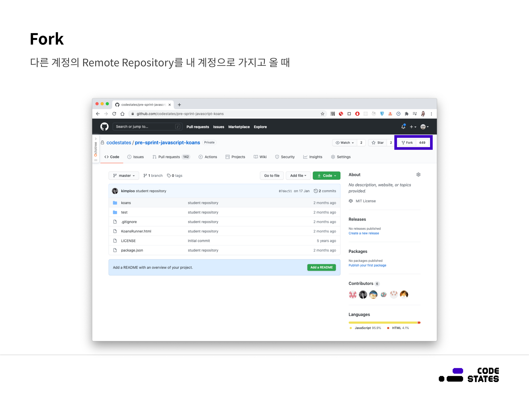 김코딩이 git-project를 Fork한 시점부터 이 git-project는 김코딩의 Repository에 복사본으로 저장된 것입니다.