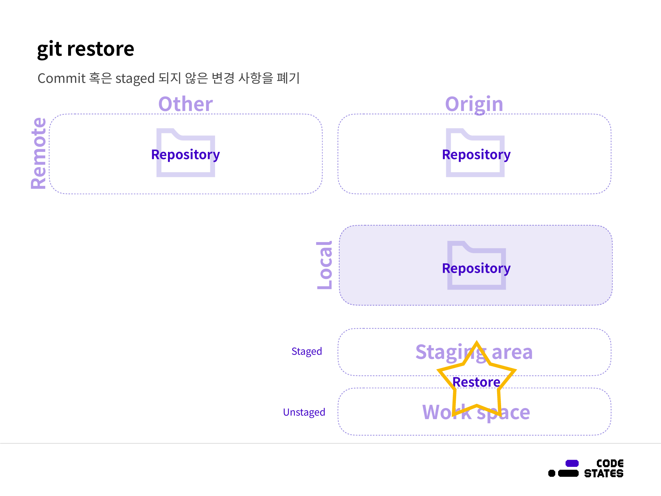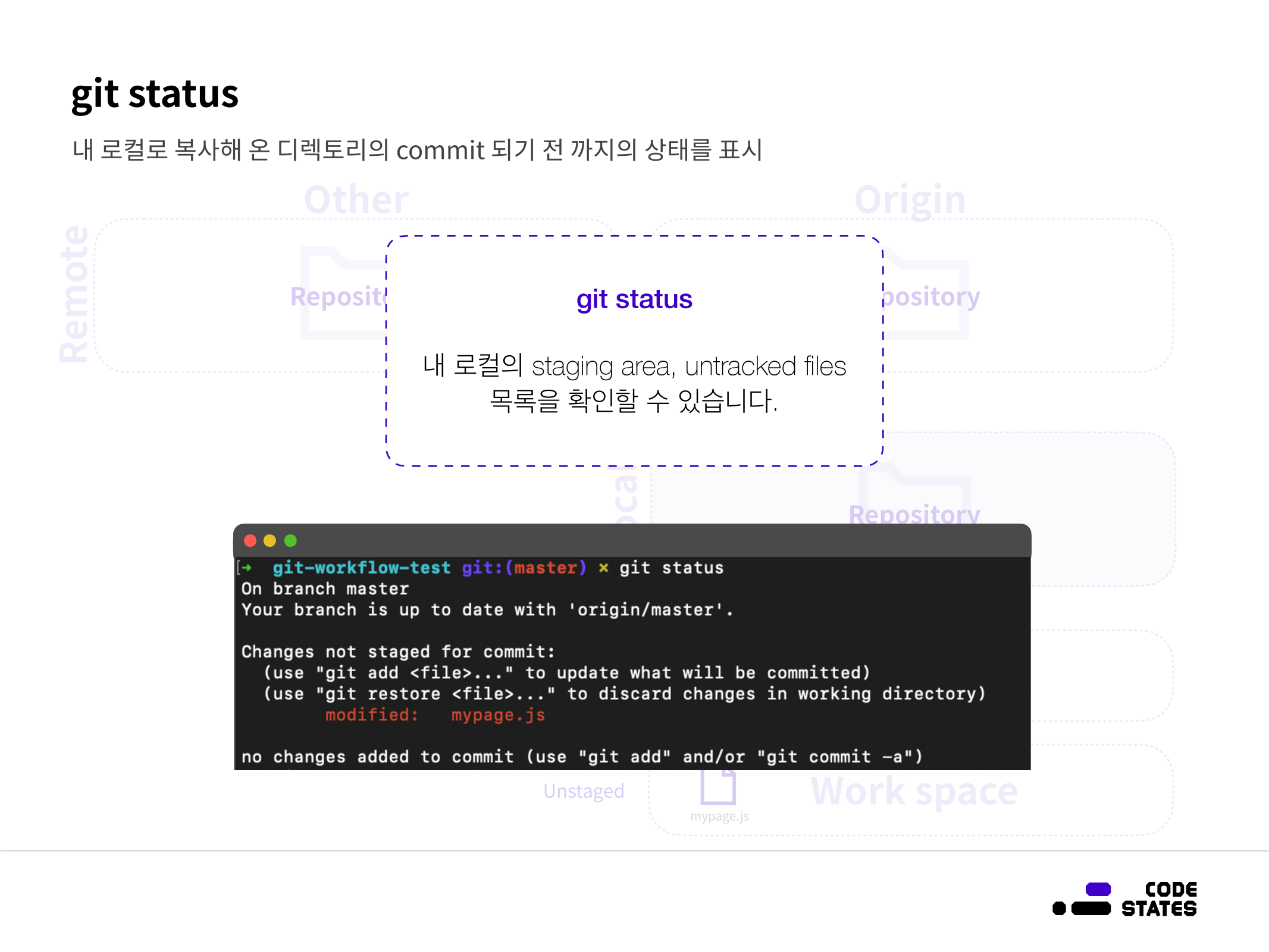 [restore] : 변경사항을 폐기(discard changes) 하는 명령어예요. 이처럼 git status 를 통해 어떤 파일이 어떤 상태에 있는지, 그리고 해당 파일에 대해 어떤 행동을 할 수 있는지 알 수 있습니다.