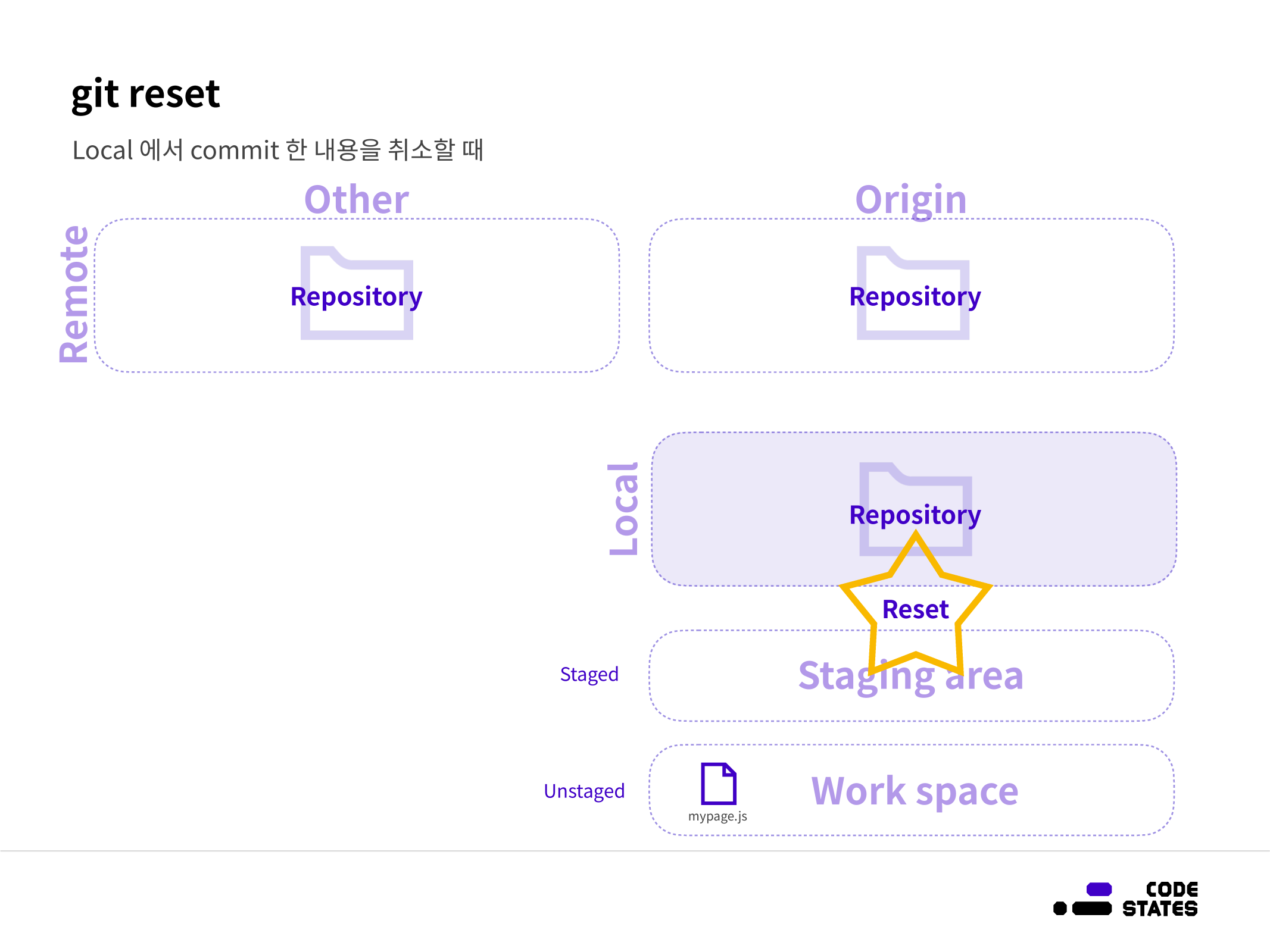 commit되지 않은 Local Repository의 변경 사항을 폐기할 수 있어요. git restore mypage.js 명령어를 통해 Work space의 변경 사항을 폐기하고 다시 처음으로 clone 받아 왔던 상태가 되었습니다.
