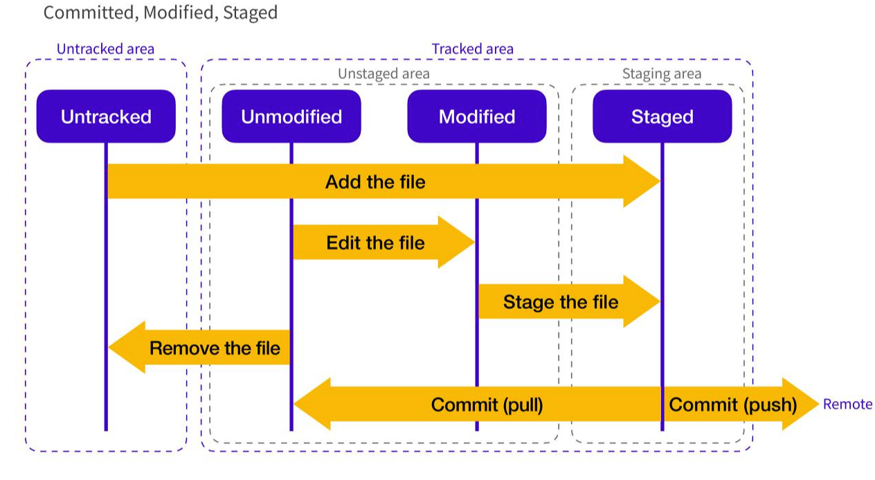 Untracked area는 Git이 관리하고 있지 않은 영역입니다. Tracked area에 들어온 파일들만 Git의 관리를 받을 수 있으며, Tracked area 내부에서도 세 가지 상태로 나누어집니다. 그 세 가지 상태가 바로 Unmodified, Modified, Staged입니다.