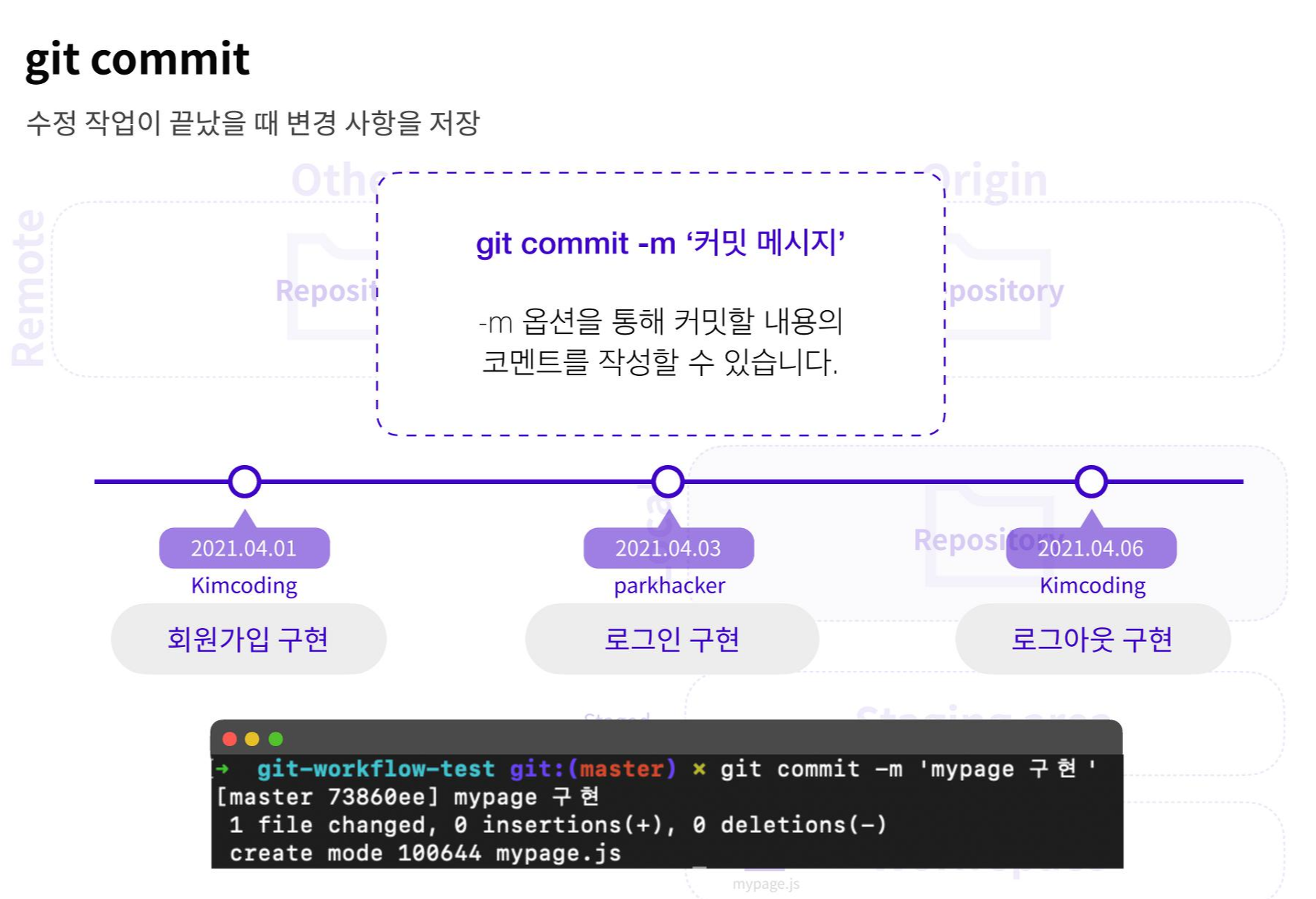 commit 메시지를 작성하기 위해서는 -m 옵션을 통해 코멘트를 작성할 수 있습니다. (git commit -m ‘mypage 구현’ 이라는 메시지)