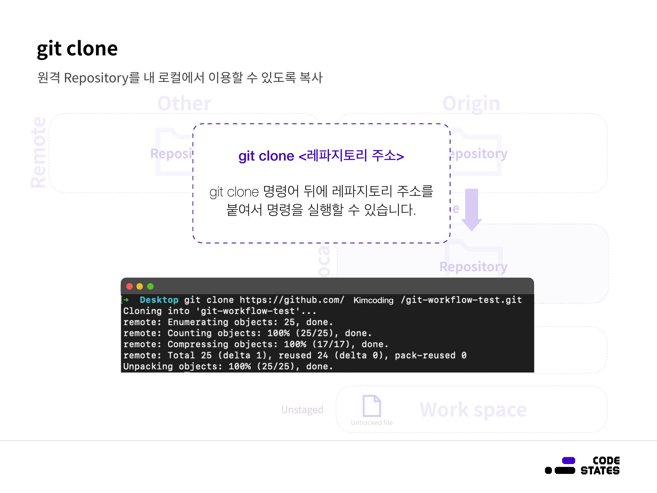 이 때 사용할 수 있는 명령어가 바로 clone입니다. git clone 명령어 뒤에 Repository 주소를 입력하면 해당 Repository를 내 컴퓨터(Local Repository)로 가져와서 작업할 수 있습니다.