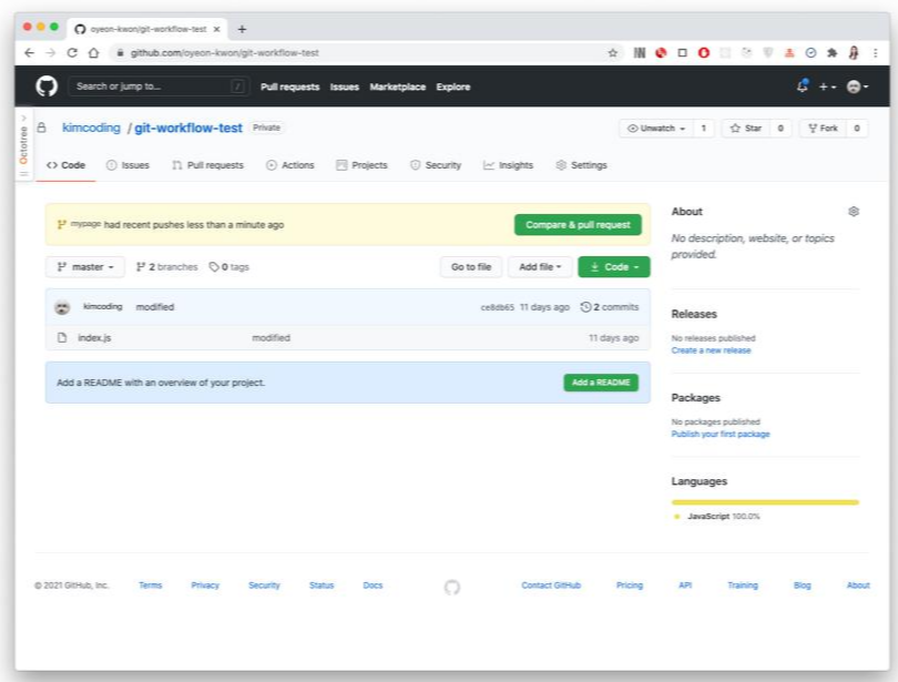 해당 화면에 작업해서 Push 해 놓은 내용을 간단하게 요약해서 알려줌으로서 동료들이 코드를 보지 않고도 어떤 내용인지 쉽게 파악할 수 있게 만들어 줍니다. 이렇게 Pull Request를 날려놓으면 여러 동료들의 리뷰도 받을 수 있고 내가 올린 작업을 기존 코드에 병합할 수도 있습니다.