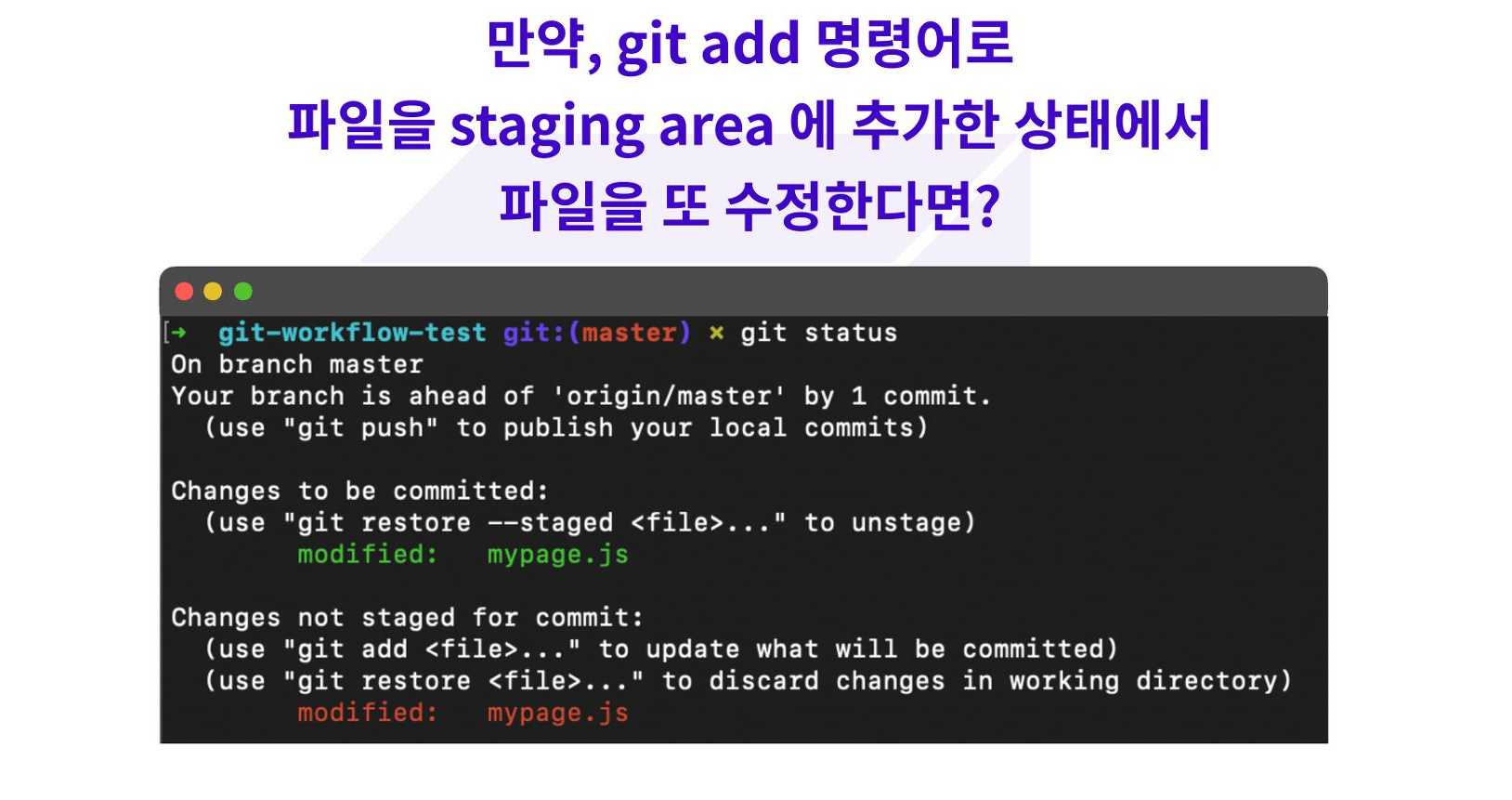 git add 명령어로 파일을 staging area에 올려 놓은 상태인데 파일을 또 수정한다면 위 터미널에 보이는 것처럼 파일이 staged이면서 modified인 상태가 됩니다. 이 시점에서 터미널은 우리가 선택할 수 있는 행동을 안내하고 있습니다.