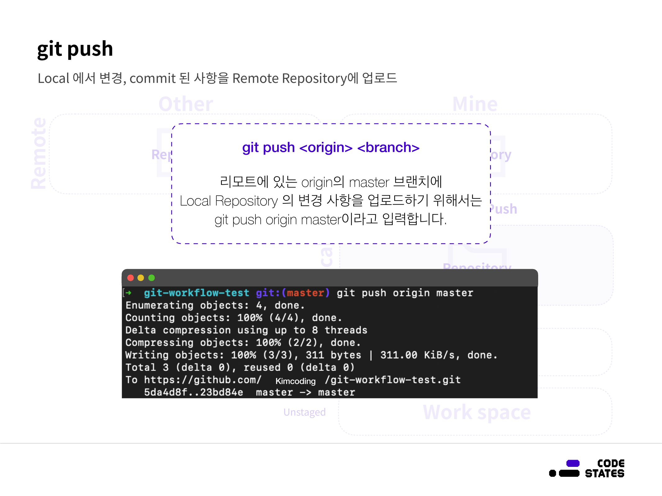 4. staging area에 들어온 파일들은 commit이 가능합니다. commit을 하고 나면 내 remote repository에 push 해서 commit 기록을 remote 에도 남겨줄 수 있습니다.