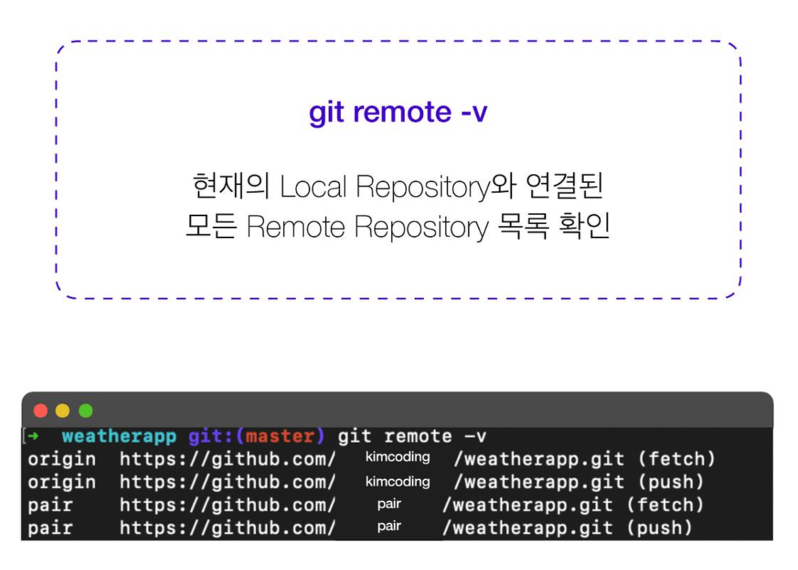 git remote -v 명령어를 통해 현재의 Local Repository와 연결된 모든 Remote Repository 목록을 확인할 수 있습니다.