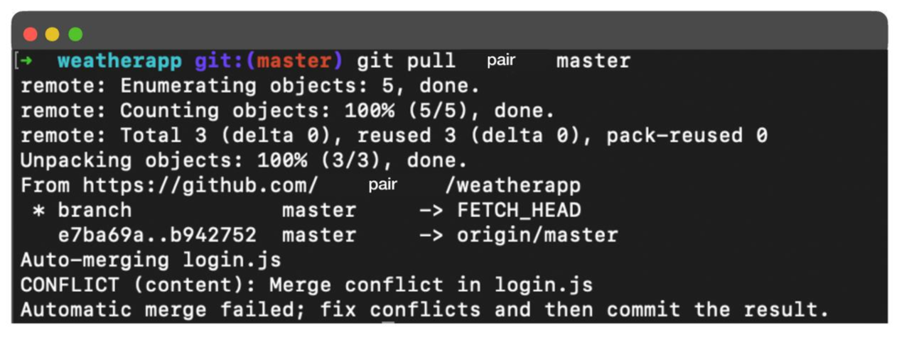 git pull pair master 명령어를 통해 페어의 Remote Repository에 있는 작업 내용을 받아올 수 있습니다. 받아오는 내용은 자동으로 병합(merge) 됩니다.