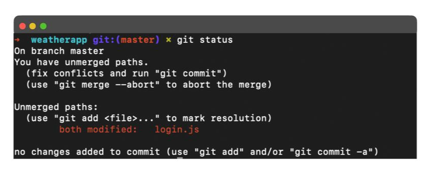 이외에도 직접 파일을 수정해서 반영하는 방법도 있습니다. 수정을 마치면 병합 커밋(merge commit)을 생성해 주기 위해서 파일을 staging area로 추가해야 합니다.