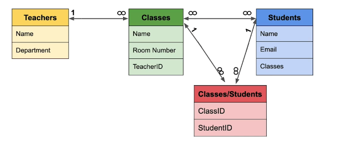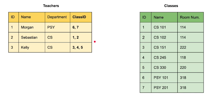 이 때, Class의 Name을 Teachers에 넣어 무슨 수업을 하는지 넣기보다 ID를 넣어 효율적으로 관리가 가능합니다.