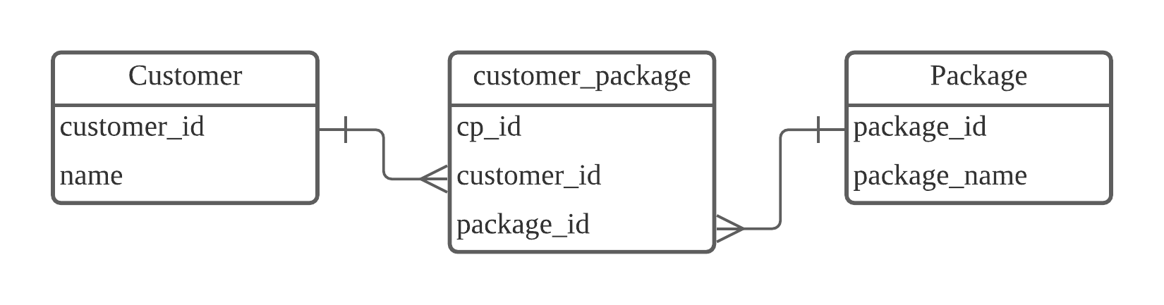 이렇게 Customer 테이블과 Package table이 따로 존재한다면, N:N(다대다) 관계를 어떻게 표현할 수 있을까요? 다대다 관계는 두 개의 일대다 관계와 그 모양이 같습니다. 두 개의 테이블과 1:N(일대다) 관계를 형성하는 새로운 테이블로 N:N(다대다) 관계를 나타낼 수 있습니다.