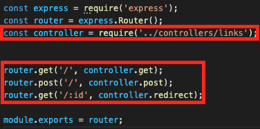 그 다음에 routes 폴더안에 있는 link.js 파일과 index.js 파일을 연결시켜 주었다. 이제 index.js 파일안에서 서버로 오는 각 요청마다 데이터베이스에서 어떻게 처리할지를 정하도록 하였다.