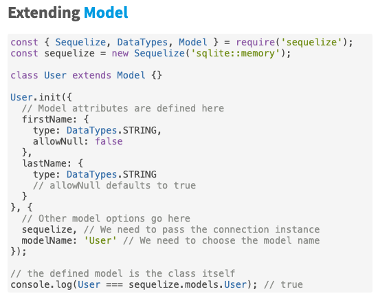 공식 문서에 따르면 모델은 Sequelize에서 아주 중요한 개념이라고 합니다. 모델은 내 데이터베이스에 있는 테이블의 축약 버전이라고 생각하면 됩니다. 모델을 통해 테이블의 이름이나 테이블의 열의 이름 등을 알 수 있습니다.