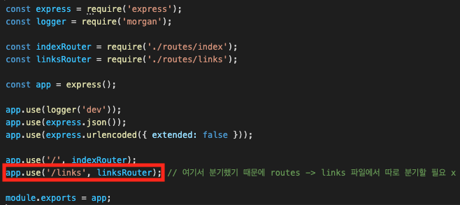 url에 /links가 붙으면 linkRouter로 이동하게 된다.