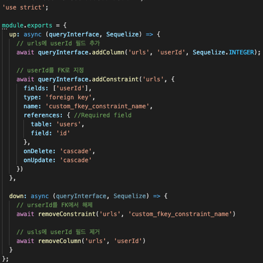 중요한 점은 undo migrations을 했을때를 위해 down에는 꼭 up에 반대되는 메소드를 작성해야 한다. up에서 userId 필드를 추가하고 FK로 지정해주었다면, down에서는 반드시 userId 필드를 삭제하고 FK를 해제하는 작업을 해주어야 한다. 이렇게 하고나서