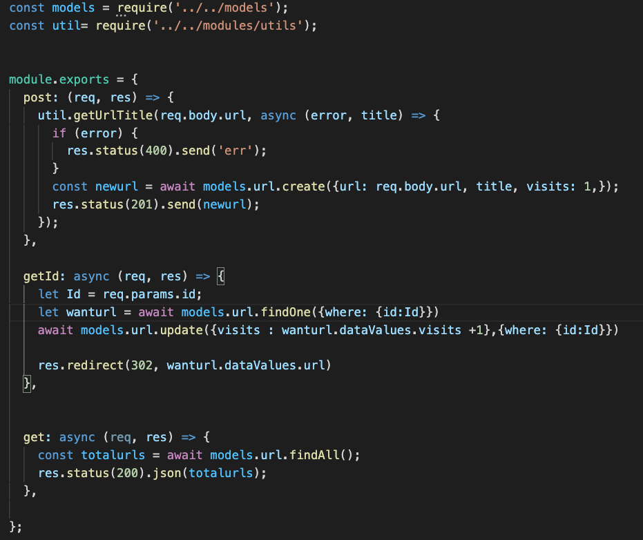 { "id": 1, "url": "https://www.github.com", "title": "The world’s leading software development platform · GitHub", "visits": 1, "createdAt": "2020-07-25T20:07:15.000Z", "updatedAt": "2020-07-25T20:07:15.000Z" }- POST 요청을 구현할 때, 웹사이트의 제목을 가져오기 위해 modules/utils.js를 이용할 수 있습니다.