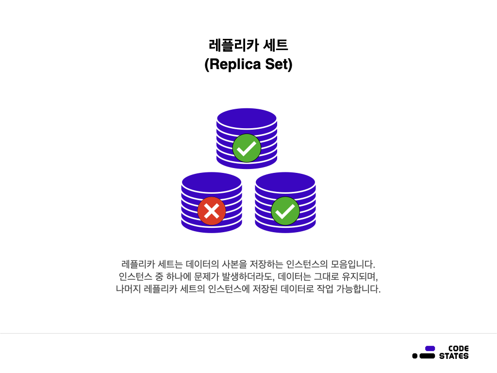 동일한 데이터를 저장하는 소수의 연결된 머신을 뜻합니다. 레플리카 세트 중 하나에 문제가 발생하더라도, 데이터를 그대로 유지할 수 있습니다. - 인스턴스