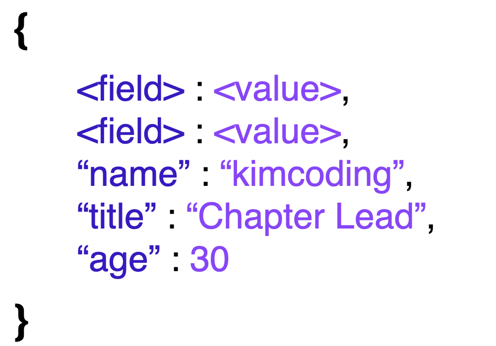 - 필드와 값이 콜론(:)으로 분리되어야 하며, 필드와 값을 포함하는 쌍은 쉼표(,)로 구분됩니다.