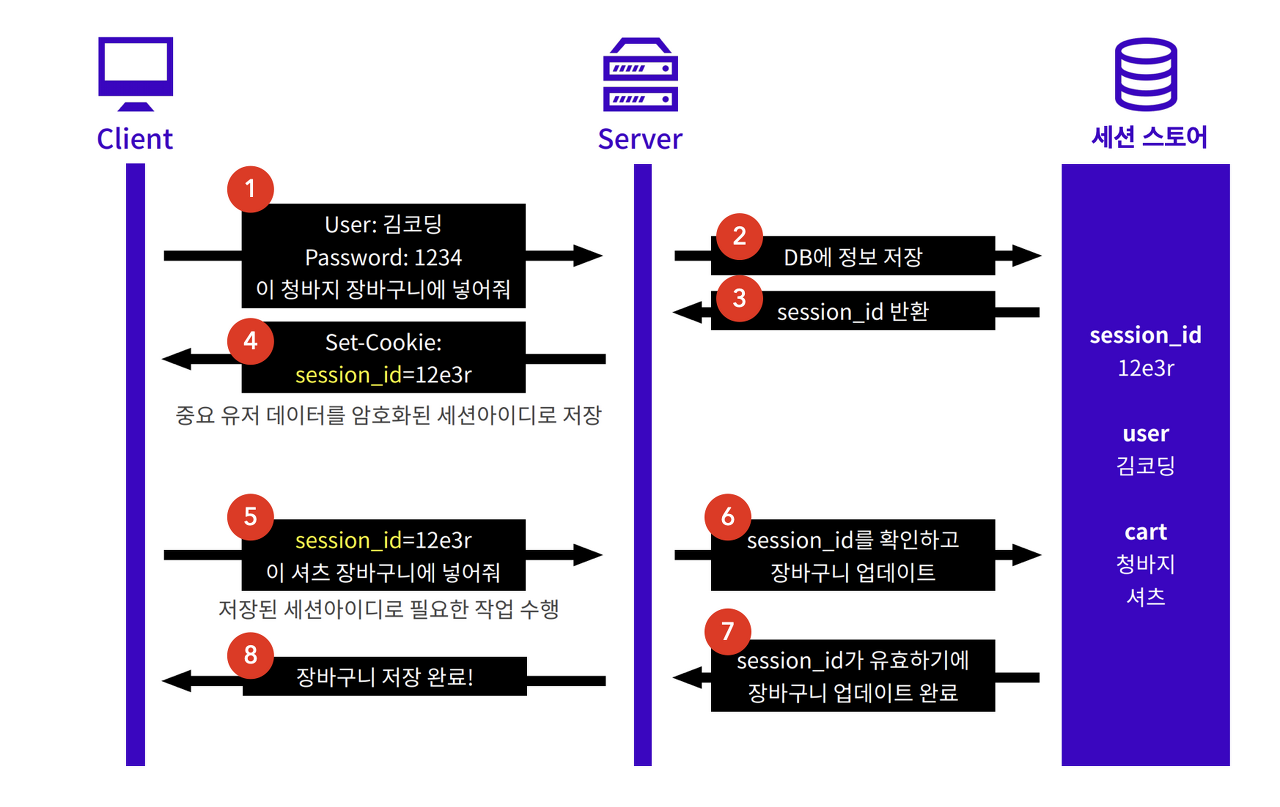 - 서버는 일종의 저장소에 세션을 저장합니다. (그림 2) 주로 in-memory(자바스크립트 객체를 생각하면 됩니다), 또는 세션 스토어(redis 등과 같은 트랜잭션이 빠른 DB)에 저장합니다.